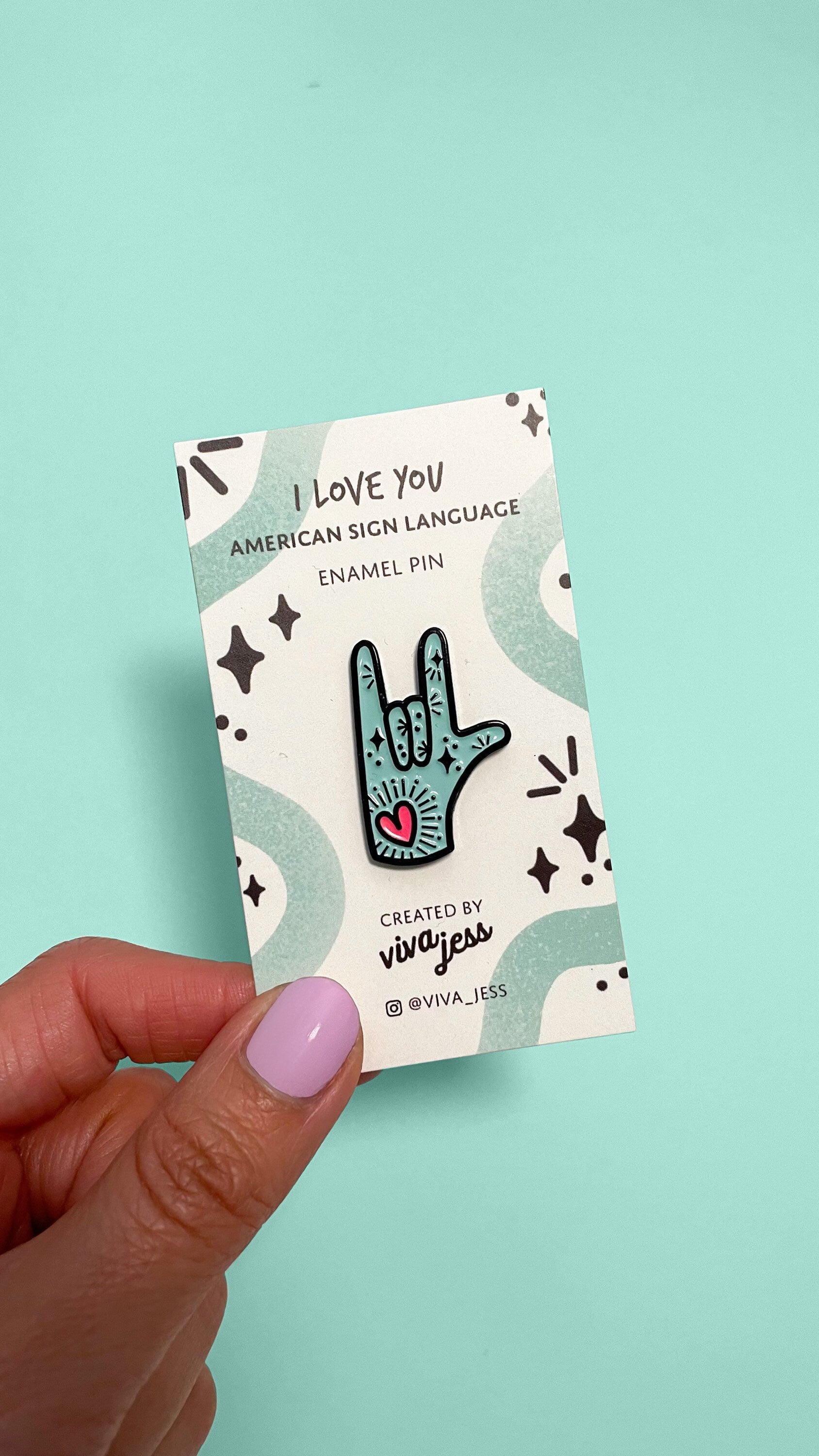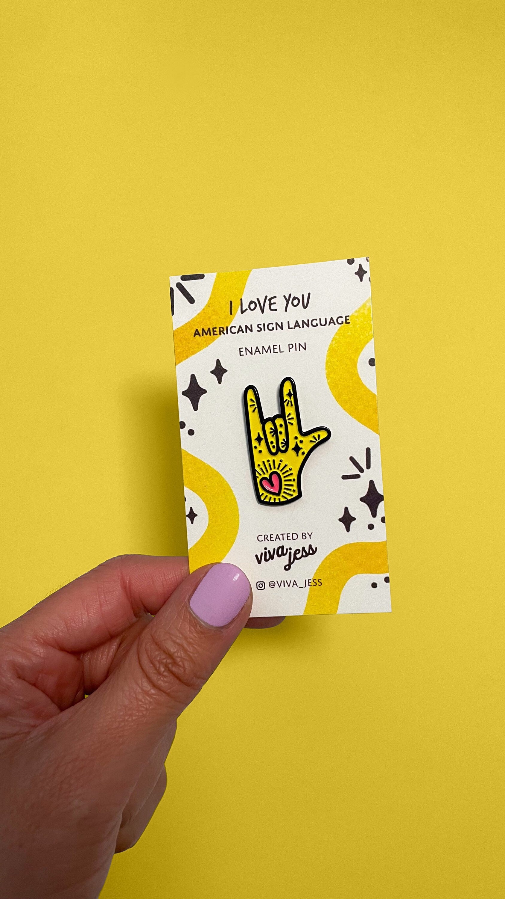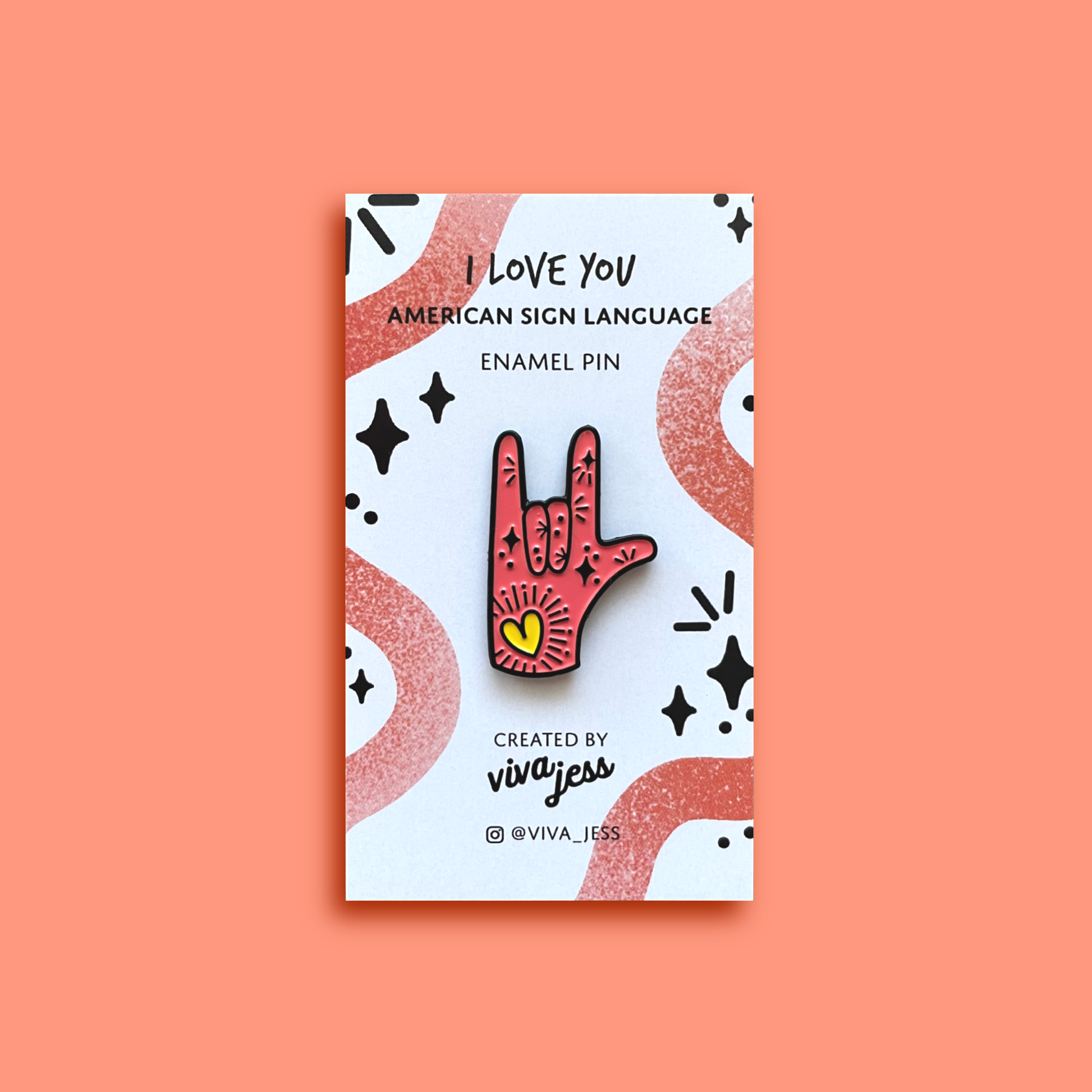 Spread the love! This is how you say "I love you" in American sign language. Wear your pin on your jacket, bag, backpack, and more, to spread the love! You will proudly wear one of these pins designed by a Deaf artist... me! The little pink heart and cute details make this pin a fun and pretty accessory.